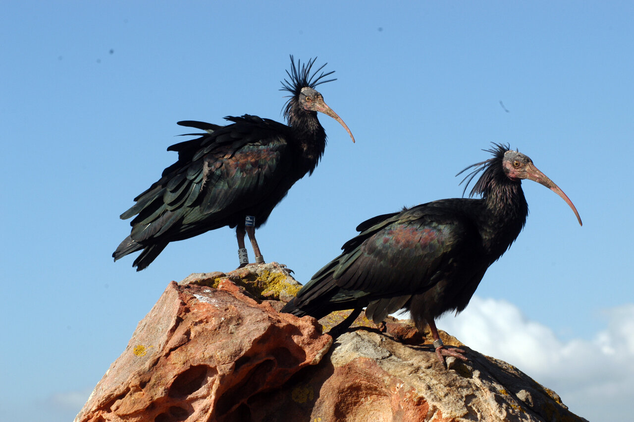 - Ibis eremita (Geronticus eremita). Ave colonial de tamaño medio de 70 - 80 cm de altura perteneciente a la Familia Threskiornithidae. Habita en zonas áridas o semiáridas de estepas, pastizales y campos de cultivo. Nidifica y encuentra refugio adecuado en cortados y acantilados costeros. Está catalogada por la UICN como en peligro de extinción. En 2003 se firmó un convenio de colaboración con la Consejería de Medio Ambiente (Junta de Andalucía) para desarrollar el Proyecto Eremita, un estudio de los métodos de liberación más adecuados para la formación de una colonia silvestre animales procedentes de cautividad. Conoce más sobre el ibis eremita y el PROYECTO EREMITA en este apartado.