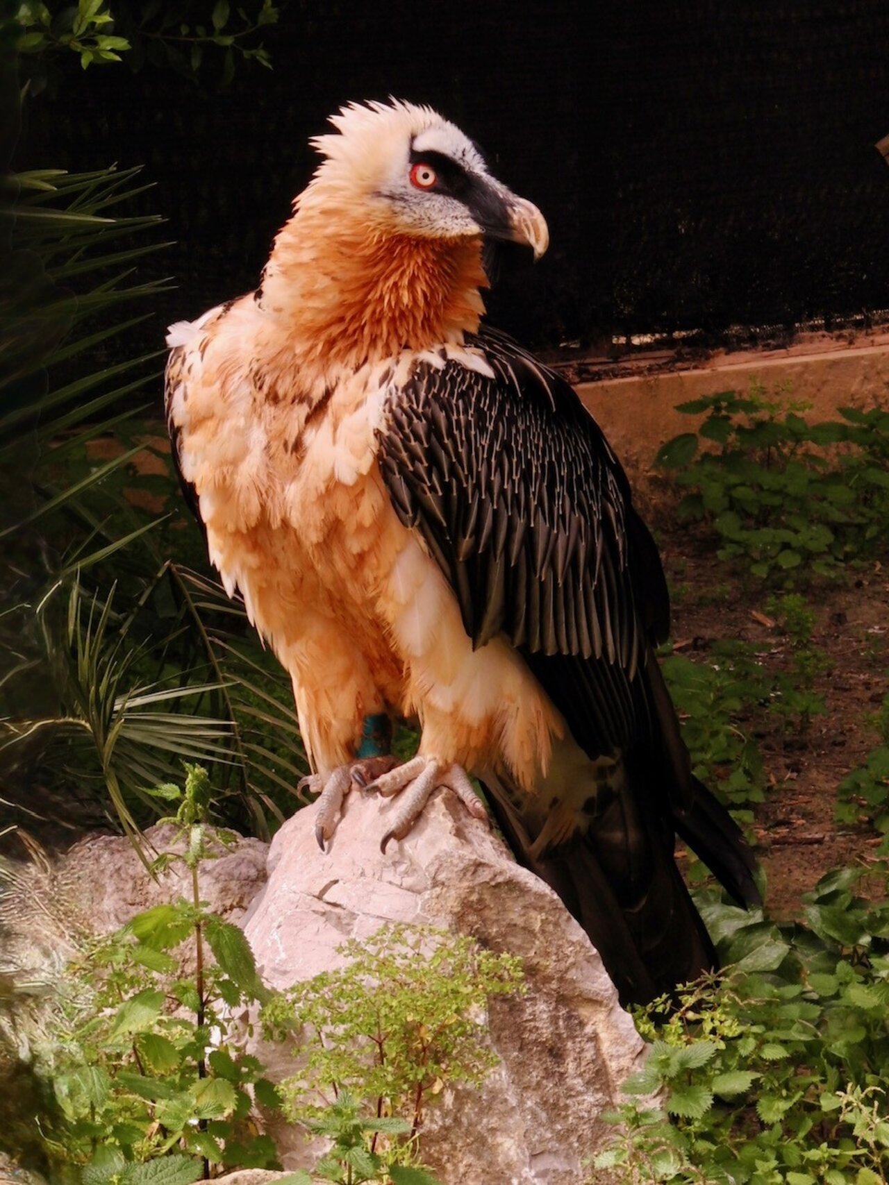 Ave de enorme tamaño, pero de formas estilizadas y perfectas. Sus alas son largas y estrechas, su cola larga y cuneiforme. Su silueta recuerda más a la de un Halcón que a la de un Buitre. Los adultos son negruzcos en el dorso, donde tienen alguna mancha blanca alargada. La cabeza es clara, con antifaz negro que cae encima del pico en un mechón de cerdas negras, a modo de perilla. Las partes inferiores son rojizas, más claras en el vientre. Algunas manchas oscuras forman una especie de corbatas sobre el pecho del ave. Esta tonalidad rojiza no se da en ejemplares en cautividad ya que se debe al contacto de las plumas con las paredes rocosas. Están emplumados hasta la base de las manos, sus calzas son muy prominentes y bajo estas llaman la atención las pequeñas manos grises azuladas. El ojo es amarillo y está bordeado por un círculo rojo. Los jóvenes son oscuros en su totalidad y la cola y las son más claras. Sobre el dorso numerosas manchas blancas dibujando un triangulo hacia la cola. No alcanzan la librea de adulto hasta los seis años de edad.